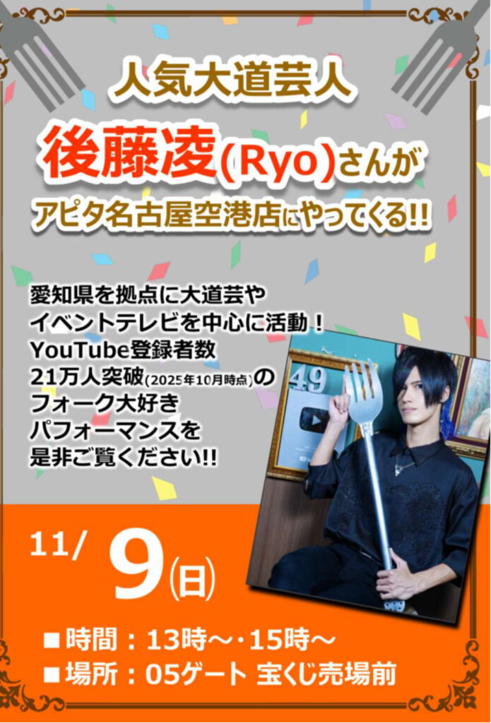 アピタ名古屋空港店(エアポートウォーク)の05ゲート宝くじ売り場前にて①13:00~②15:00~で大道芸させて頂きます!屋外ですが屋根があるので雨天でも実施!ぜひお待ちしております🍴