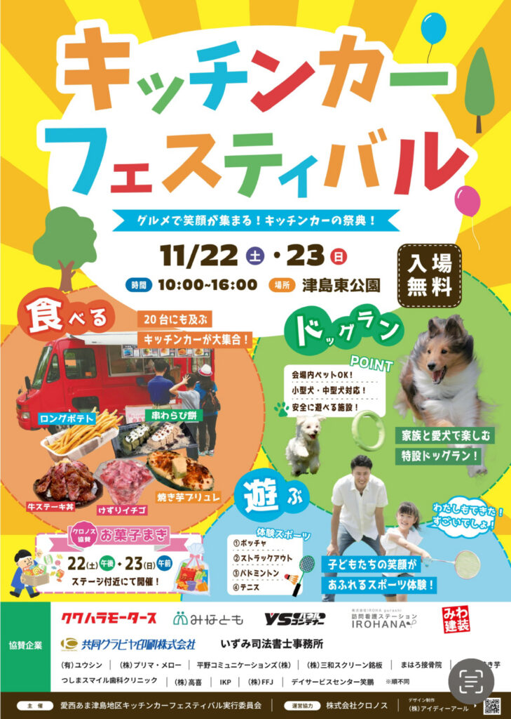 津島東公園で開催されるキッチンカーフェスティバルにて13:00から1公演だけ大道芸させて頂きます!飲食も一緒にお楽しみください🍴