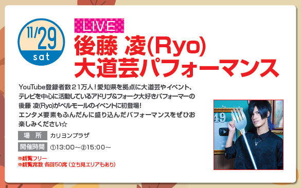 平和堂長久手店の屋上駐車場で開催される”秋祭り”にて①11:00〜②14:15〜の2公演大道芸させて頂きます!⚠️合間の13:00~13:30では”後藤 凌(Ryo)と対決企画(先着20名)”がまた開催されるのでお楽しみに🍴
