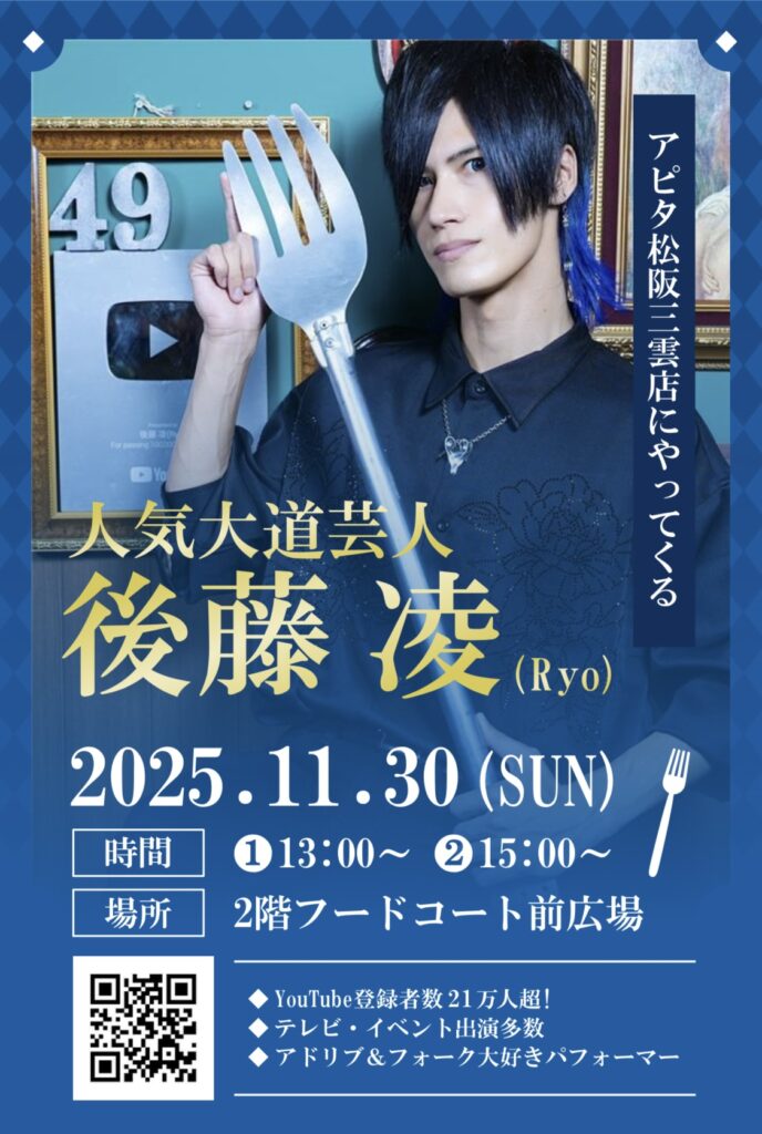 アピタ松阪三雲店の2F フードコート前広場にて①13:00~②15:00~の2公演大道芸させて頂きます!ぜひお買い物がてらにお越しくださいませ🍴