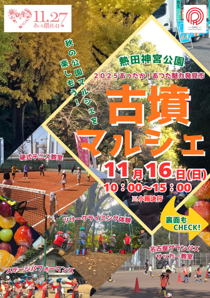 熱田神宮公園の管理事務所前で開催される”古墳マルシェ”にて11:00から1公演だけ今年も大道芸させて頂きます!キッチンカーやブース出店もあるのでお楽しみに🍴そしてその後は移動して!