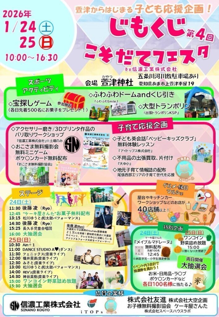 萱津(かやつ)神社で開催される”じもくじこそだてフェスタ”にて①11:30前~②14:30前~で大道芸させて頂きます!様々な催しもお楽しみください🍴